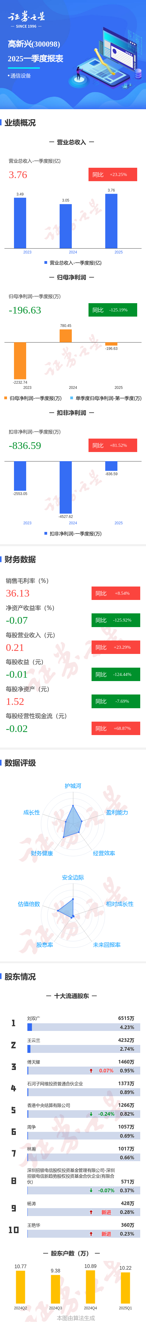 证券之星消息,高新兴2025年一季报显示,公司主营收入3.76亿元,同比上升23.26%;归母净利润-196.63万元,同比下降125.19%;扣非净利润-836.59万元,同比上升81.52%;负债率42.11%,投资收益3.48万元,财务费用-409.3万元,毛利率36.13%。